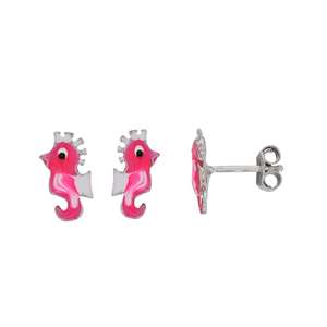 Boucles d'oreilles puces hippocampe émail fuchsia et argent 925/1000 rhodié (31318257F)
