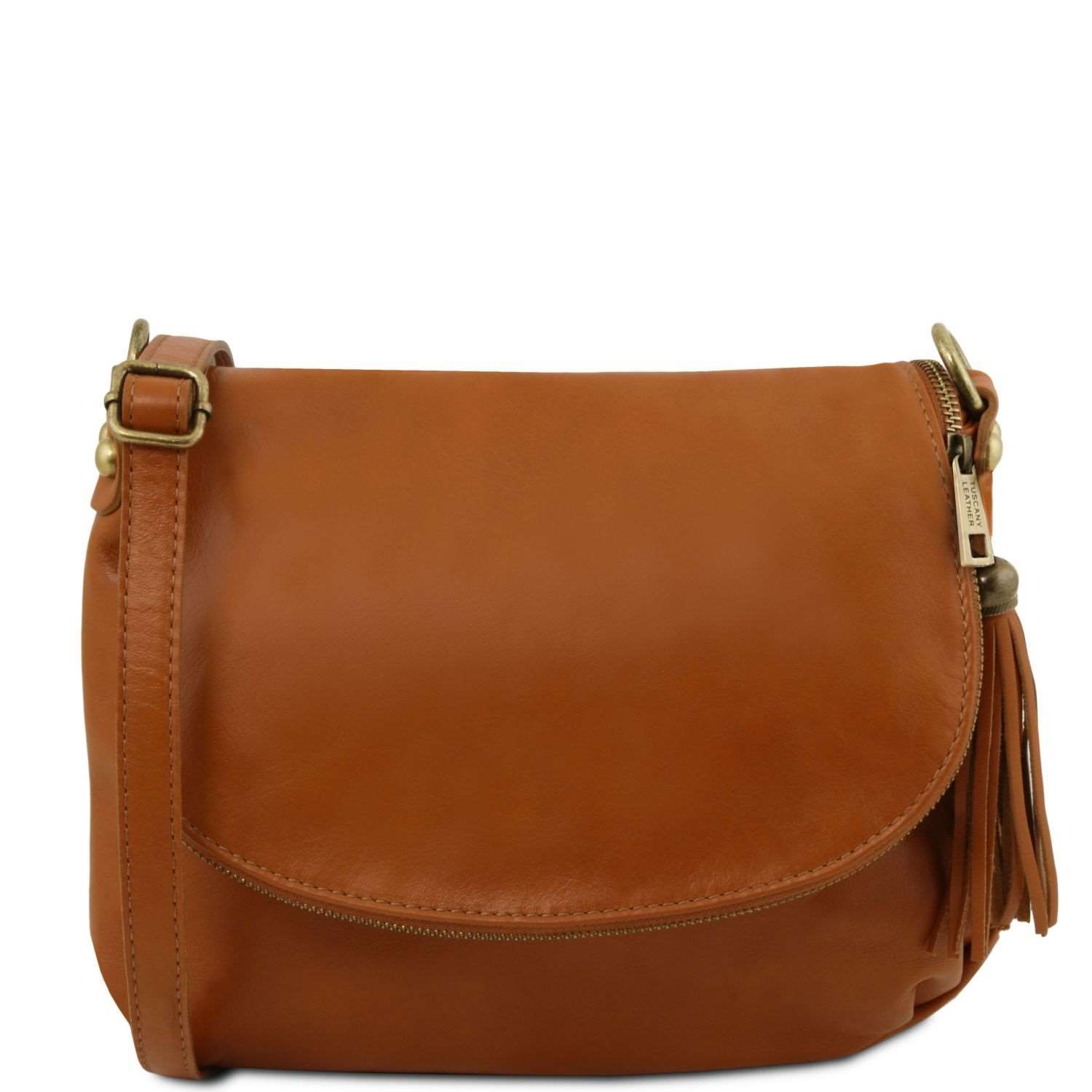 TL Bag - Sac bandoulière besace en cuir souple avec pompon - Cognac (TL141223)