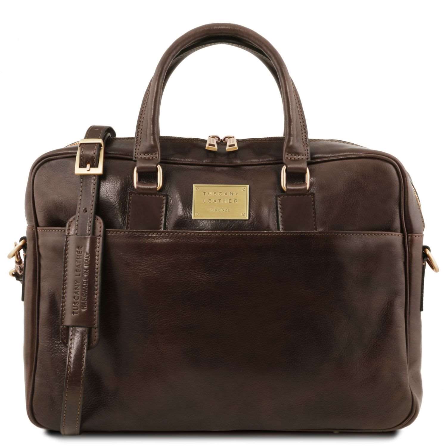 Business de chez 'Tuscany Leather' (Ref: 1894_1_5) - Composition: Cuir pleine fleur avec un tannage végétal, tamponné à la main, Textile en coton - Fonctionnalités: Structure souple, 2 compartiments - Partie extérieure: Passant pour trolley, Pieds en métal sur le fond, Poche sur la partie frontale avec fermeture - Partie intérieure: Poche à l'intérieur porte ordinateur, Attache Porte-clés, Poches pour cartes de credit, Poche à l'intérieur avec fermeture éclair, 2 Poches, 2 Poches pour stylos , Séparation intérieure pour protéger les montres - Bandoulière: Bandoulière réglable, Bandoulière amovible, Bandoulière en cuir - Format: Il peut contenir format A4, Contient ordinateur portable 15.6' - Parties métalliques: Finitions en laiton, Finitions en nickel - Fermeture: Fermeture glissière - Accessoires: Sac protecteur - Dimensions: 15 x 40 x 30 cm - Poids: 1,4 kg - Garantie fabriquant 2 ans - Fabriqué en Italie